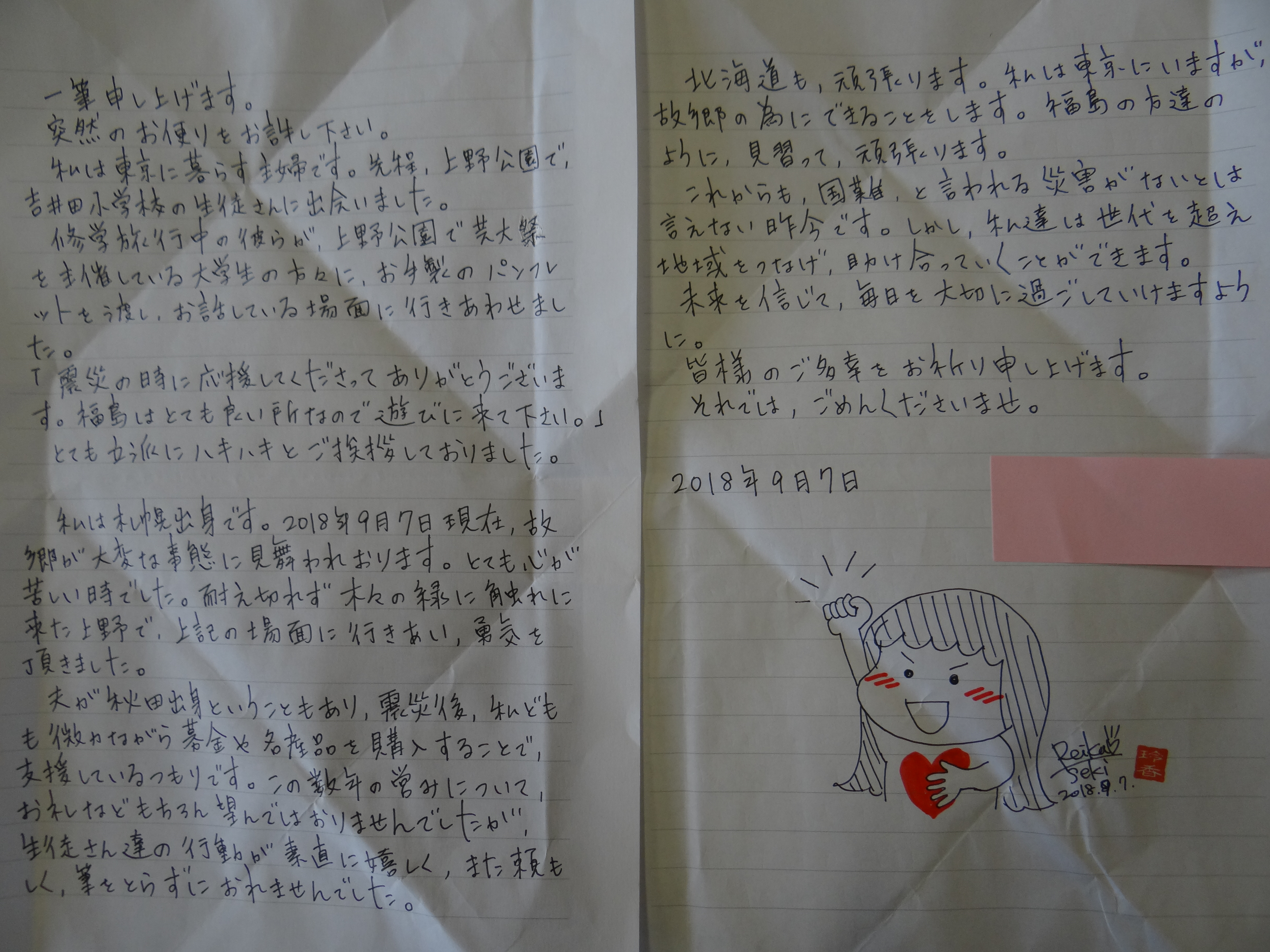 「一筆申し上げます。突然のお便りお許しください。私は東京に暮らす主婦です。先程、上野公園で吉井田小学校の生徒さんに会いました。修学旅行中の彼らが、上野公園で芸大祭を主催している大学生の方々に、お手製のパンフレットを渡し、お話している場面に行き合わせました。『震災のときに応援してくださってありがとうございました。福島はとてもよいところなので遊びに来てください。』とても立派にハキハキとご挨拶しておりました。