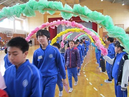 3月6日(月)3・4校時に6年生を送る会が体育館で開かれました。5年生が会場に飾りつけをし、華やかな会場での6年生を送る会となりました。各学年の出し物は、1年生「歌とダンス」2年生「クモ歩きの鬼ごっこ」3年生「早口言葉対戦・歌」4年生「6年生と対戦 長縄跳び」5年生「鼓笛移杖」6年生「合唱 この星に生まれて」でした。6年生への感謝の気持ちがあらわれた良い会でした。