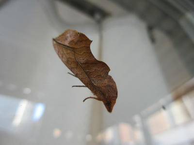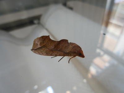 【答え】は、【コノハガ】という昆虫です。足が見えます。右側が頭です。木の葉にそっくりですね。