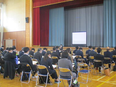 午後から研修会が開かれました。本校では、体育科研究部員95名が集まり、熱心に話し合いが行われました。