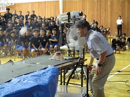 2016年10月4日 14時22分10月4日(火)防災教室を体育館で行いました。1年から3年生は、荒川の洪水や土石流の話を中心に聞きました。4年生から6年生は、火山についての話を聞きました。冬の融雪泥流と火山灰の危険性について実験を交えながら聞きました。全学年とも大きな土石流の実践装置で実験を見学したことで水の危険性を理解することができました。