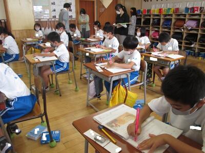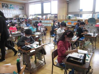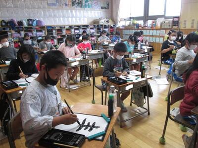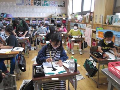 4年生が真剣に「麦」の文字と向き合い、筆順や払いの方向に気を付けて、一生懸命に書いていました。