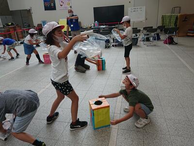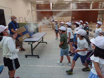 午前中は、空気砲の実験やUVチェックストラップ作りにチャレンジ。学校とは違う空間で、楽しく学んでいます。