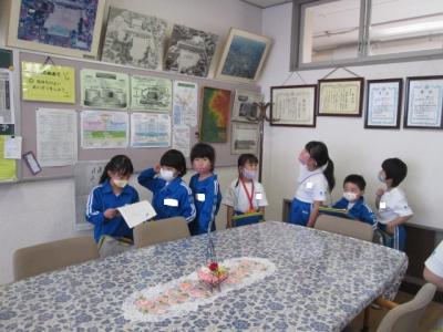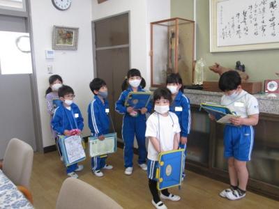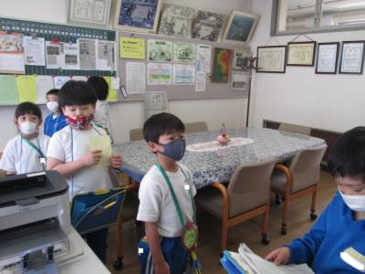 今日は2年生が1年生を案内しながら、学校探検を行いました。校長室にも4つのグループがやってきました。どの班の2年生も、1年生を気遣ったり、優しく教えてあげたり、お兄さんお姉さんぶりを発揮。一年間の成長を感じます。