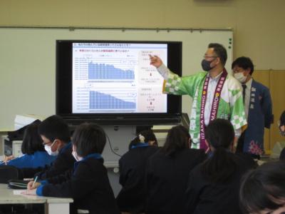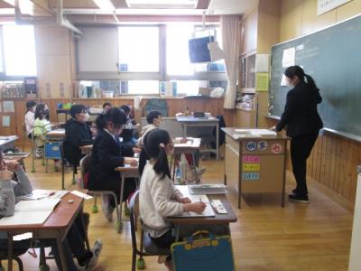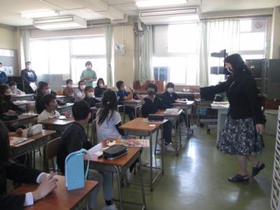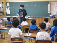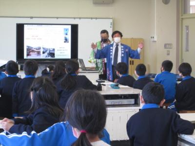 今年度も飯坂温泉観光協会から、祭屋湯左衛門 若旦那の柳沼公貴さんと、ほりえや旅館 若旦那の和田一成さんにおいでいただき、地元の観光産業の活性化のための活動についてお聞きしました。数々の資料をもとに、子供たちに問いかけながら一緒に考えたり、「飯坂小唄」を生の三味線の演奏で聞かせてくださったり、有意義な2時間となりました。ありがとうございました。