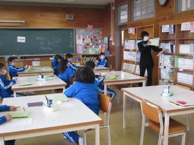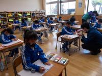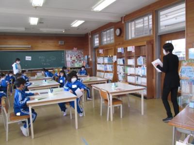 学校司書の先生から、図書館でのきまりや本の借り方・返し方などを教わった一年生。分類番号の書き方も説明されていましたが、書けたかな? 選んだ本があった所に自分のファイルを入れる手順に、「どこにあった本かわかるように入れておくんだね。」と、納得しながら話を聞く児童も見られ、頼もしく感じました。