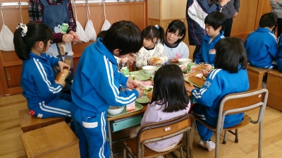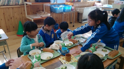 2016年2月22日 17時00分 本日(2月22日)1年生とにしね幼稚園の年長児が一緒に給食を食べました。