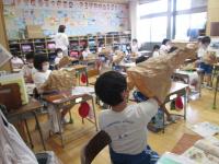 2021年6月1日 12時25分2年生の図画工作では、紙袋や新聞紙をくしゃくしゃにしたり、ぎゅっと丸めたりしていました。どうするのかな?と見ていたら、丸めた新聞紙を袋に入れて口を縛り・・・。袋の角をねじって「耳」にしたり、縛った袋の口を「尾びれ」にしたり、いろいろな生き物に変身していきました。