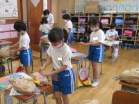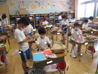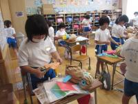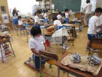 2年生の図画工作では、紙袋や新聞紙をくしゃくしゃにしたり、ぎゅっと丸めたりしていました。どうするのかな?と見ていたら、丸めた新聞紙を袋に入れて口を縛り・・・。袋の角をねじって「耳」にしたり、縛った袋の口を「尾びれ」にしたり、いろいろな生き物に変身していきました。