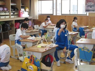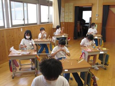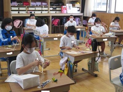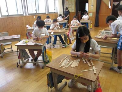 2021年9月29日 12時52分4年生の図工は「つなぐんぐん」。割りばしや木の枝などを輪ゴムやモールでつなぎます。