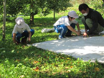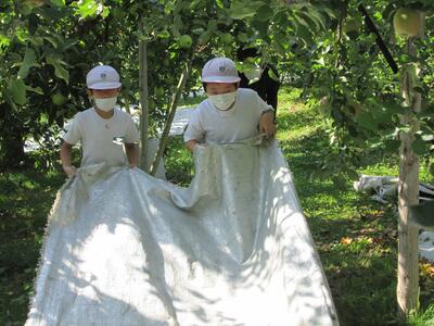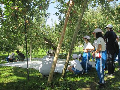 今日は、リンゴに陽があたるようにシルバーシートを敷く作業を体験させていただいたそうです。また、収穫の時にリンゴを分けていただくのですが、その際、自分のリンゴだと分かるように、リンゴにシールを貼らせていただきました。思い通りの模様が浮かび上がるとよいですね。
