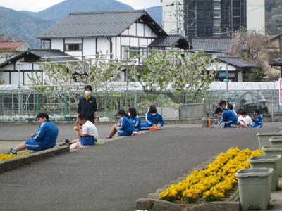 2022年4月22日 12時53分今日は1~4年生は遠足で出かけていますが、5・6年生は学校に残ってお勉強。でも、お昼の時間ぐらいは遠足気分を味わおう!と、5年生は外でお弁当を広げました。密にならないように離れたり、同じ方向を向いたり、背中合わせに座ったり、それぞれに工夫して楽しいお昼となりました。保護者の皆様、おいしいお弁当を作っていただき、ありがとうございました。
